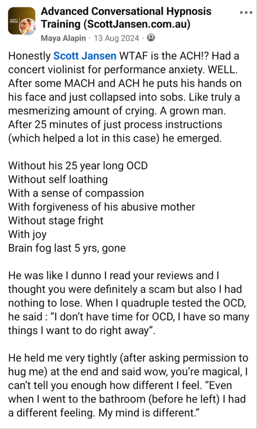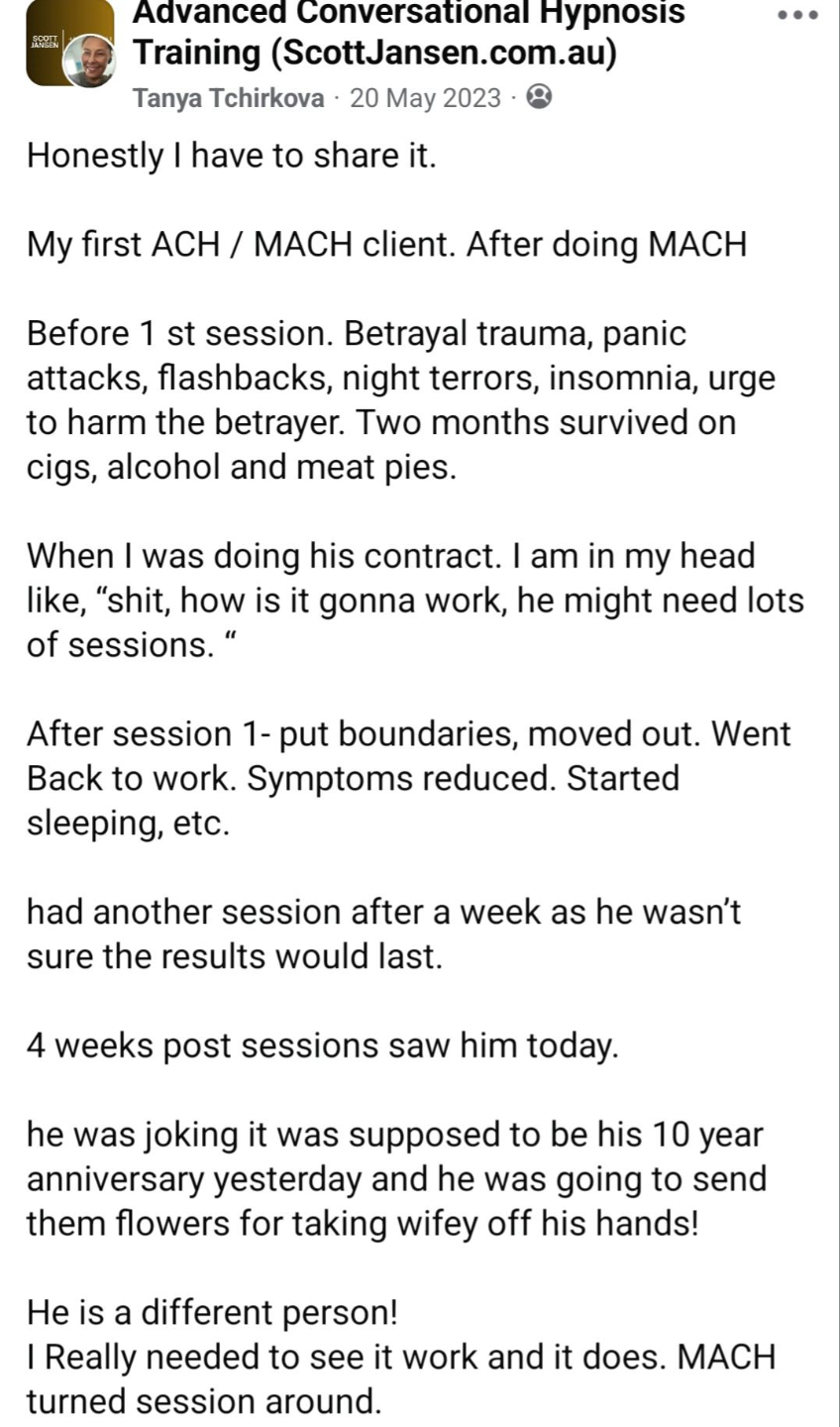 Unlimited and lifetime access to all future online 3-day Master of Advanced Conversational Hypnosis (ACH) trainings.