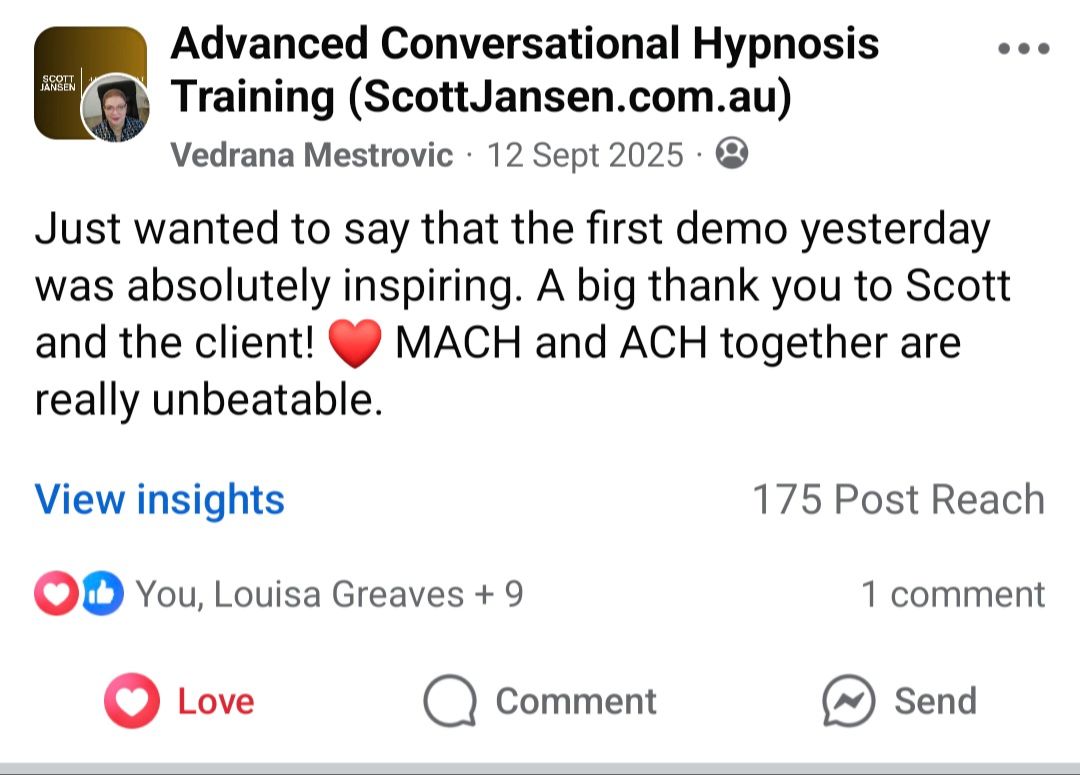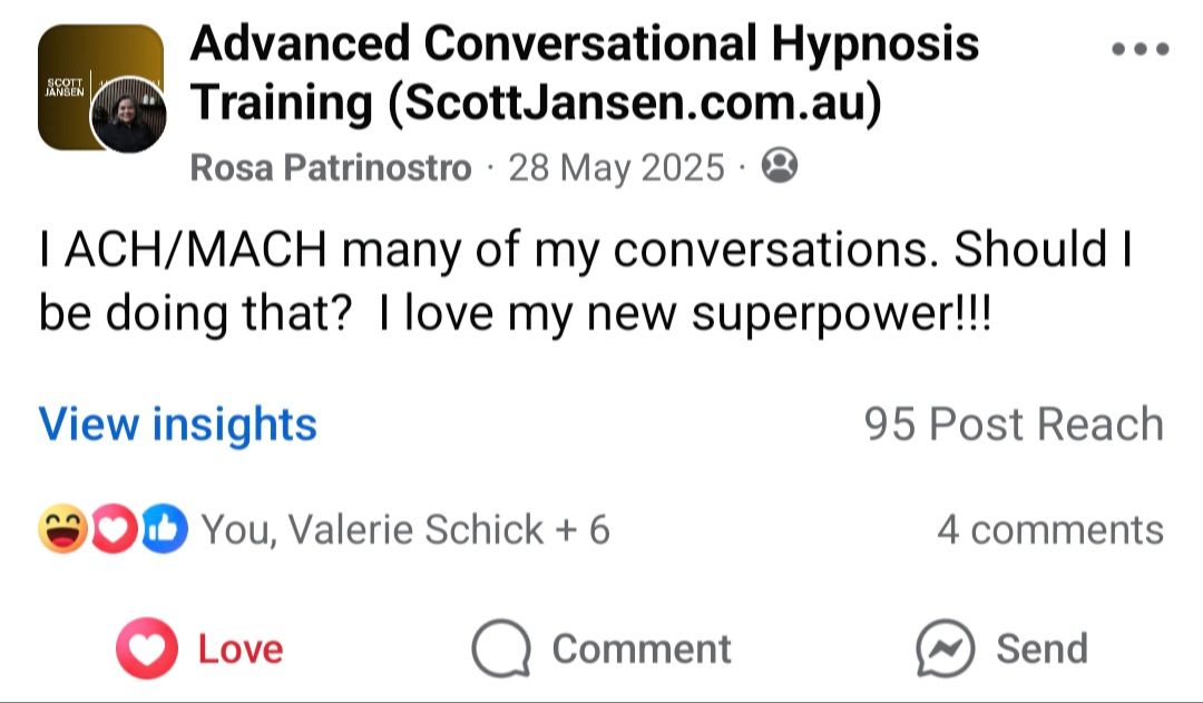 Day 3: Advanced Unconscious Moments – blending ACH and MACH: How to instantly ‘assess’ the LEVEL and POTENCY of unconscious moments on the spot and how to add new ‘therapeutic’ meaning to even their most painful problems – thus every conversation now becomes hypnotic.