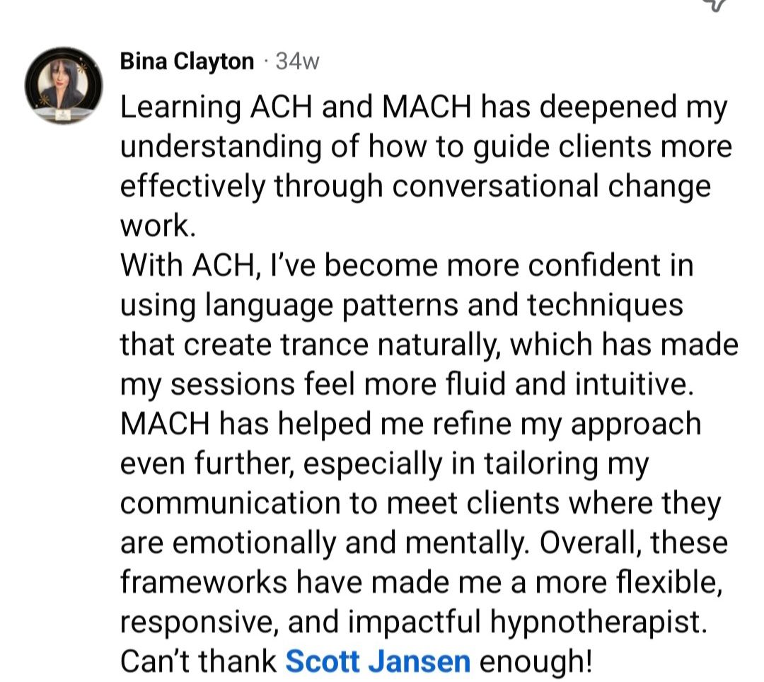 - Advanced skill in spotting unconscious moments, including those made famous by Ericksonian therapy — refined within A.C.H.™ to occur naturally inside ordinary conversation.